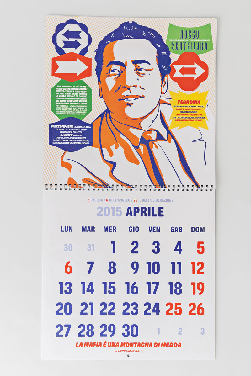 L’associazione Falcone Borsellino di Montescaglioso fu fondata nel 1994, alla fine di un periodo buio della vita della comunità montese. Nata dalla volontà di comuni cittadini e piccoli imprenditori, vittime della violenza del racket dell’estorsione, annovera tra i suoi principali compiti l’educazione alla legalità delle giovani generazioni. Questo l’intento delle pagine del calendario, dedicate alle vittime di mafia e proposte nello stile delle cartine di arance a colori sgargianti, con scene ispirate alla pubblicità delle grandi marche o alle réclame da circo, con cui si avvolgevano le arance come caramelle. Il progetto sfrutta gli stilemi di questo immaginario popolare al fine di sensibilizzare le persone su un tema sociale: la lotta alla mafia, una spa che fattura 135 miliardi di euro all’anno, un’azienda che non va mai in crisi, la causa principale del mancato sviluppo del Sud.