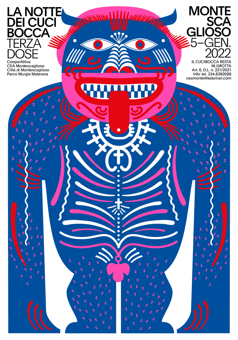 Looking at the works of Mauro Bubbico, two words immediately come to mind: design and identity. The identity that is built through design or, if you want, design that comes from identity. These words are the very reason of Mauro's professional work, because for him the profession can not be separated from the recognition of one's own roots and of personal and collective history. And then the history and traditions (sociai, religious or apotropaiche does not matter) of his land, that deep South that embraces Matera and stretches to the plain of Salento. In the Bubbico's poster exudes the soul that Ernesto De Martino had taken to tell us, that Pasolini had portrayed in his gospel, that emigration for generations has been wet with its own sweat. But Mauro Bubbico, as we have said, builds a powerful graphic system through history, which becomes an epic tale, with the dialect that replaces the language, with the lights and fans of the patron saint's festivals, with the humorous and sometimes foul-looking ceramics, the Cola Cola di Beniamino Loglisci of Gravina in Puglia (but also here and there, with some tasty reference to the world of international graphics, from Oscar Schlemmer, to Maurice Sendak to Kasimir Malevich).